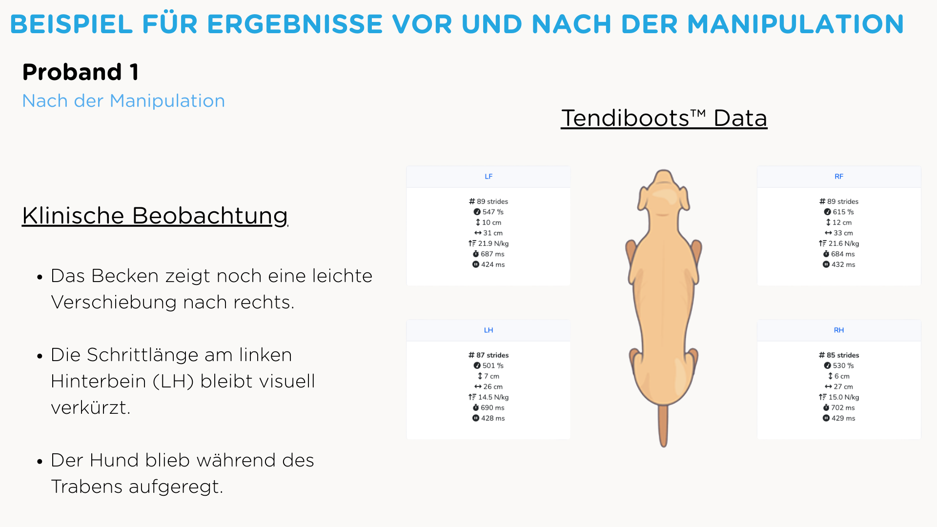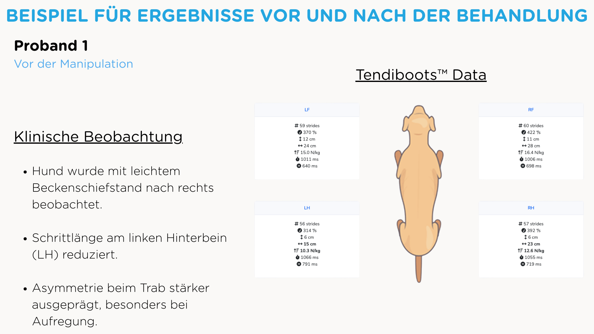 Dieser liebe Patient kam zu uns mit einem leichten Beckenschiefstand und einer verkürzten Schrittweite auf einem Hinterbein. Nach der Bewertung mit den Tendiboots™-Sensoren zeigten die Daten deutlich weniger Kraft und eine kürzere Schrittweite auf dieser Seite.