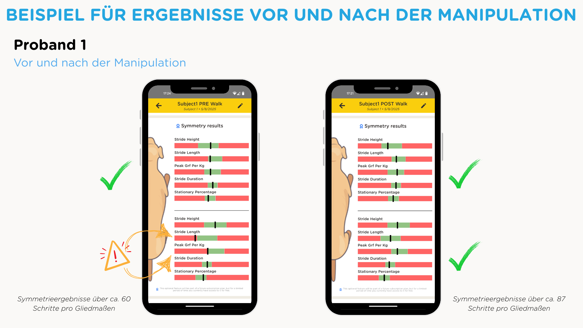 Nach einer sanften, kraftarmen McTimoney-Anpassung zur Rebalance von Becken und Wirbelsäule führten wir den Gangtest erneut durch – und die Verbesserung war sofort sichtbar.