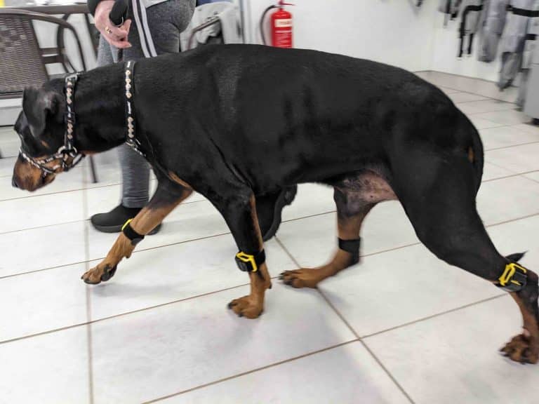 A further evaluation was then performed by Dr. Fugier to analyze the dog’s gait dynamically using the Tendiboots™ Canine system.