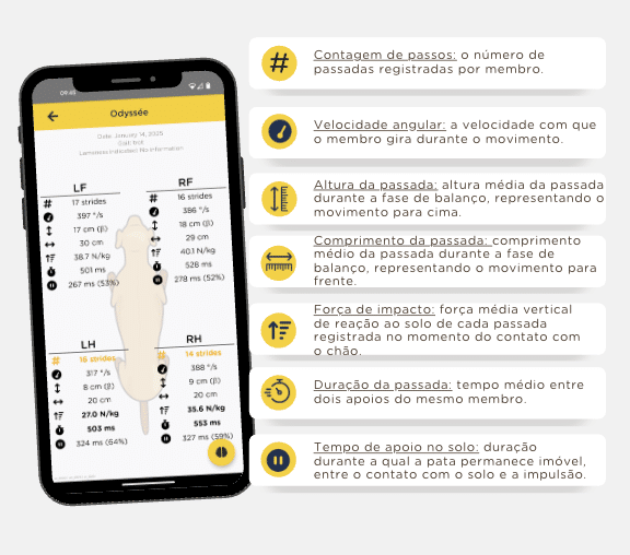 • O tempo do ciclo de passada está claramente reduzido (383 ms para o posterior direito contra 759 ms para o posterior esquerdo). Em diagonal, há compensação com um alongamento no membro anterior esquerdo (847 ms) em comparação ao anterior direito (762 ms).